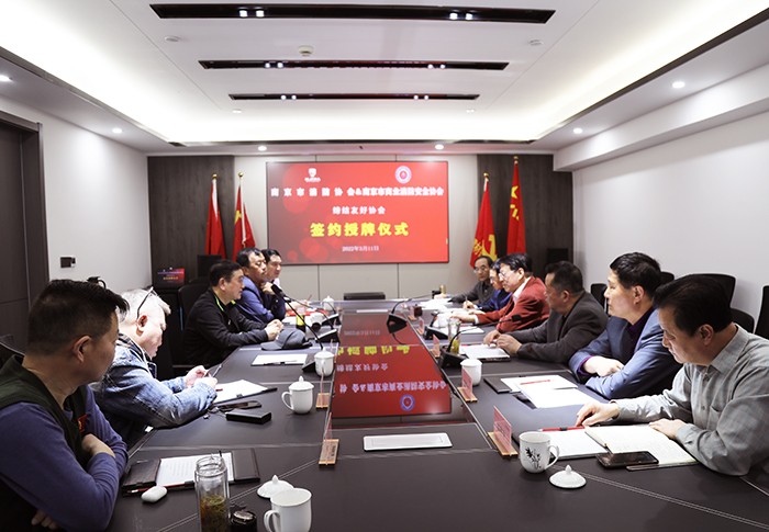 2022年3月11日下午,南京市消防协会、南京市商业消防安全协会联合举办缔结友好协会签约仪式并进行工作交流。监事长伍和员、名誉会长丁九鸿、南京市商业消防安全协会会长傅敦汛出席会议并讲话,副秘书长管守礼、监事徐爱家、王成林,南京市商业消防安全协会常务副会长兼法人许俊荣、秘书长牟世松及双方相关工作人员出席会议,常务副会长兼秘书长吴学高主持会议并致词。