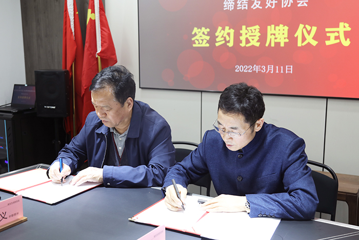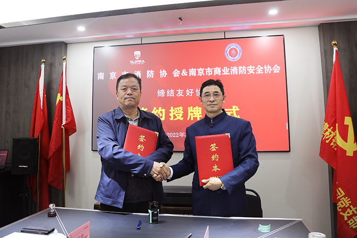 随后举行“缔结友好协会”签约仪式,秘书长吴学高与南京市商业消防安全协会秘书长牟世松上台签约。