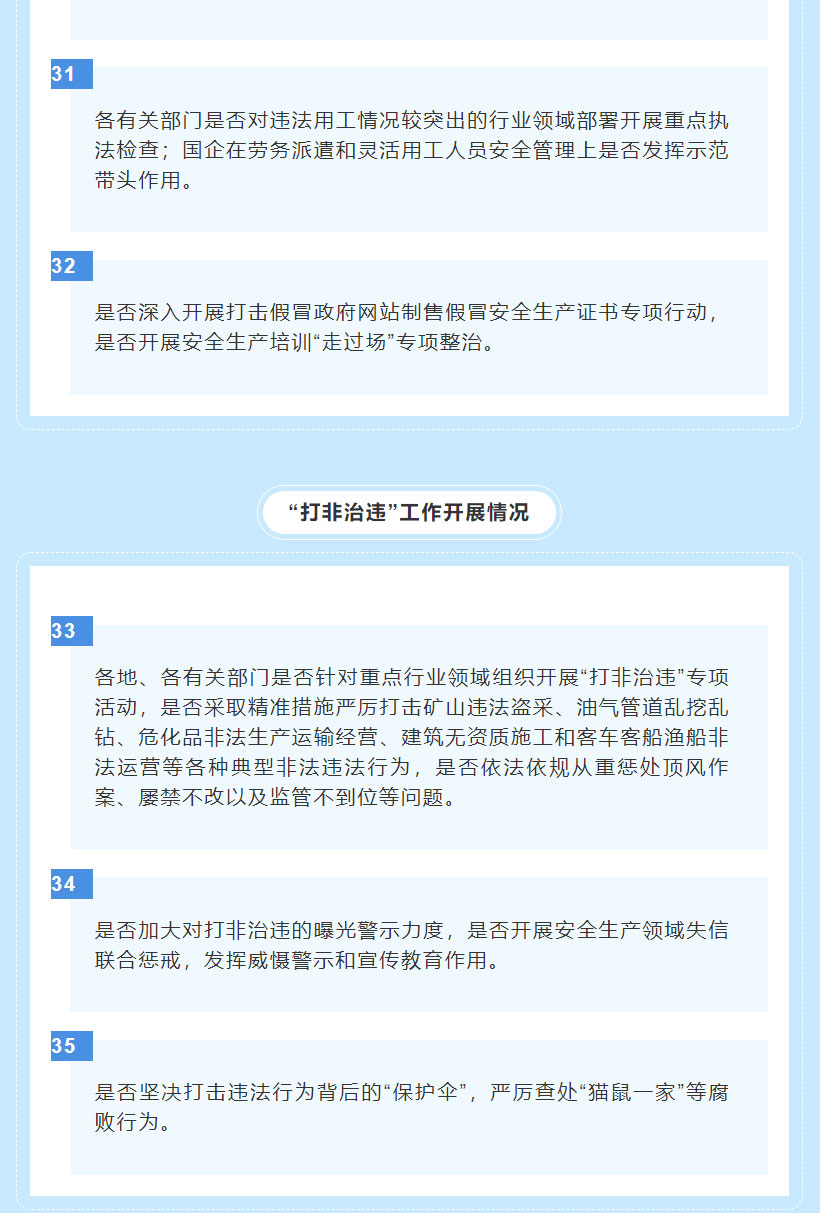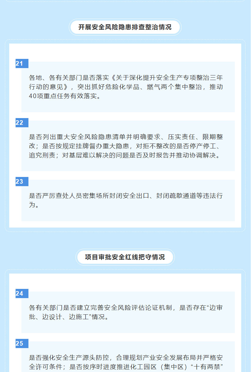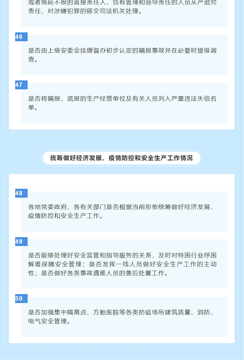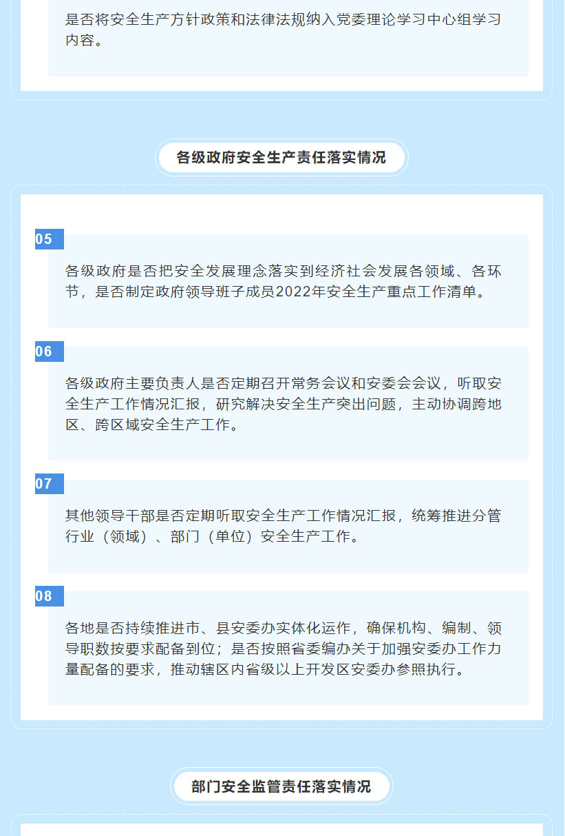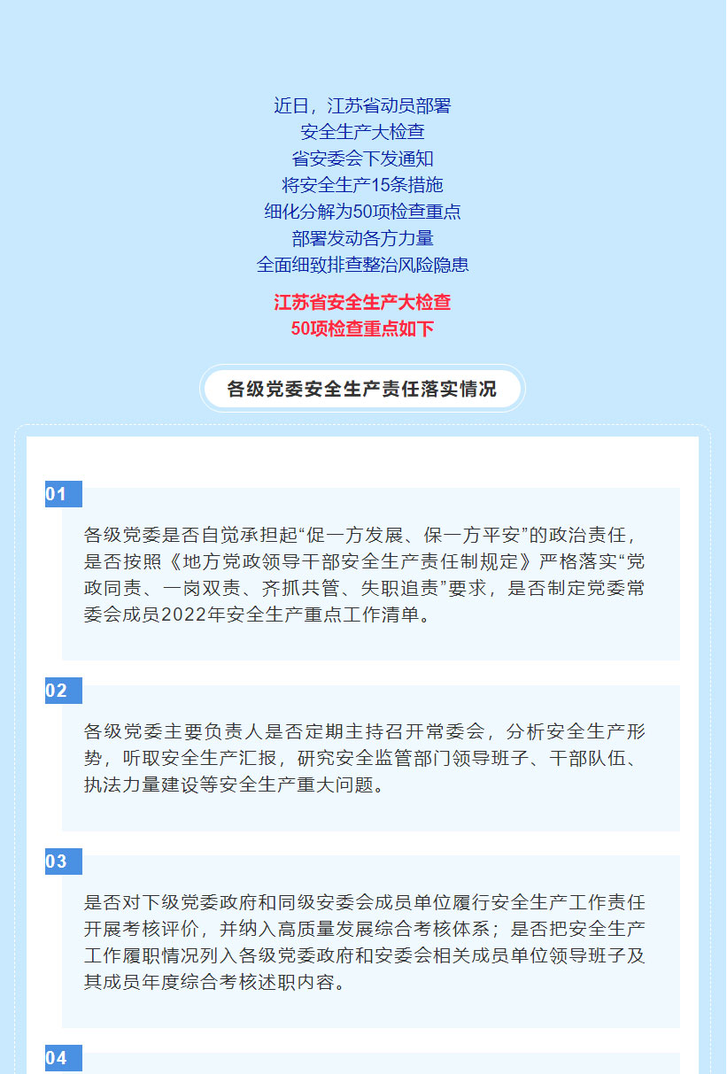会议要求,要深入学习贯彻习近平总书记关于安全生产的重要指示,认真落实李克强总理批示,提高政治站位,充分认清开展安全生产大检查的重要性、必要性、紧迫性,作为一项政治任务抓紧抓实。要坚持目标导向、问题导向、结果导向,严格对照国家“15条硬措施”和我省“50项检查重点”,坚持条块结合,聚焦危化品、建筑施工、城镇燃气、消防、道路运输、水上运输和渔业船舶等重点领域,开展全覆盖检查。要在发现和解决问题上下功夫,即查即改、立行立改,做到隐患见底、措施到底、整改彻底,切实把风险隐患消除在萌芽状态、未发之时。要聚焦五一、汛期、中秋、国庆等重要节点,加强分析研判,打好安全生产主动仗。要压紧压实党政领导责任、部门监管责任、企业主体责任和“三管三必须”,强化过硬作风,力戒形式主义、官僚主义。要提高检查精准性,文明执法、规范执法,加强对企业的服务指导。充分运用信息化手段和受理群众举报等方式,实施高效督导。要统筹做好经济发展、疫情防控和安全生产工作,加强防灾减灾救灾、值班值守和应急处置,确保安全生产形势平稳向好,以实际行动迎接党的二十大胜利召开。