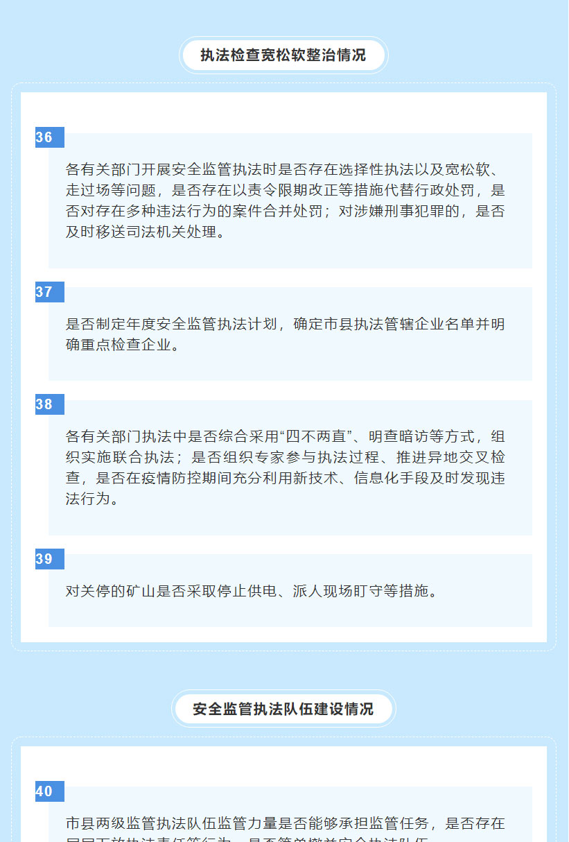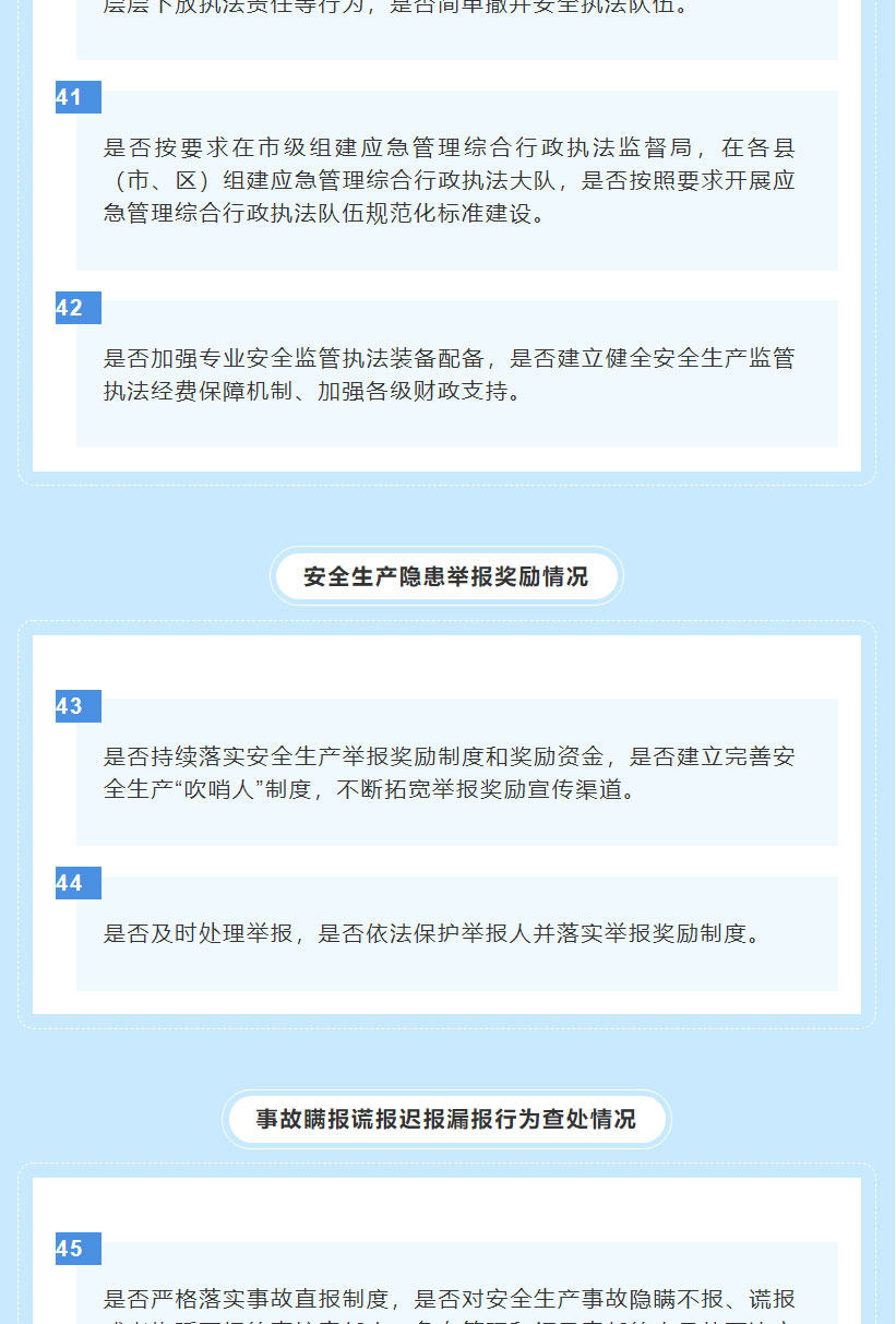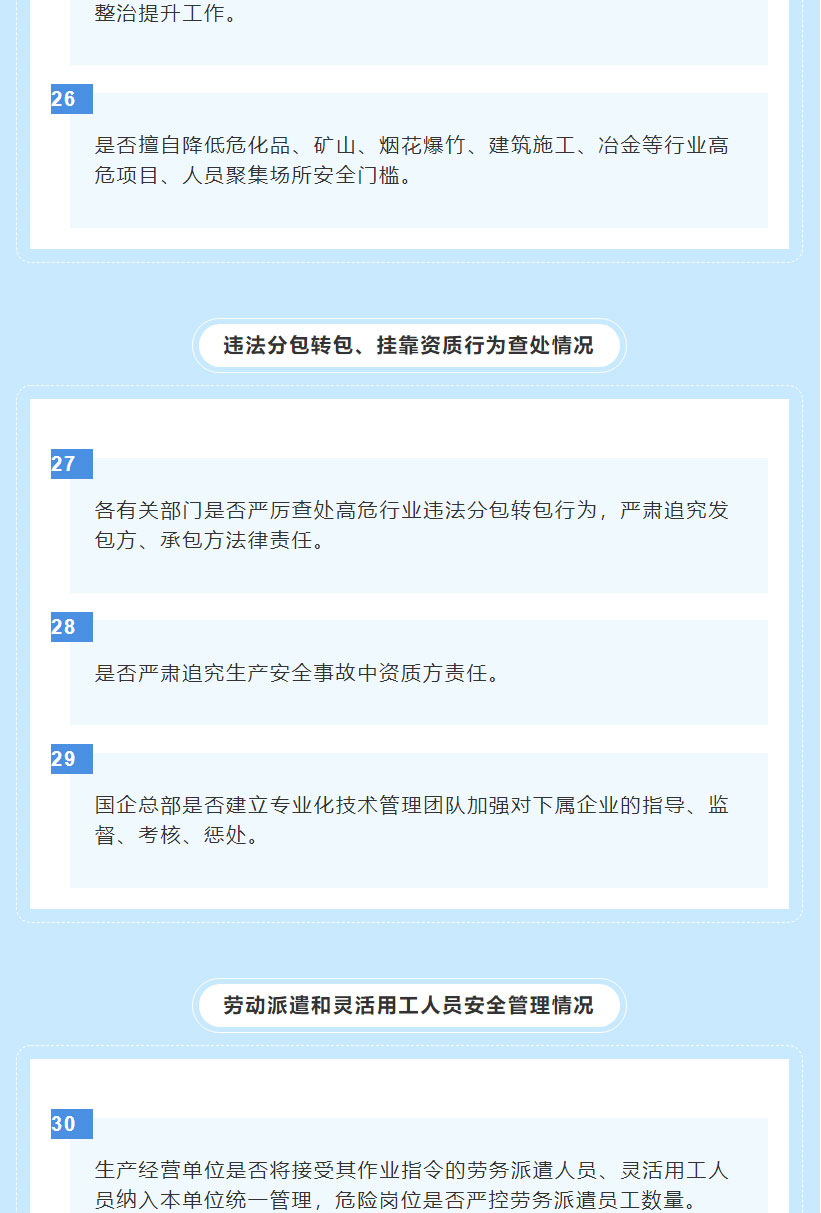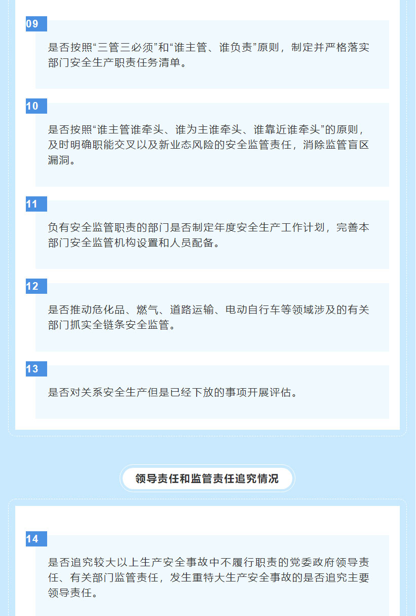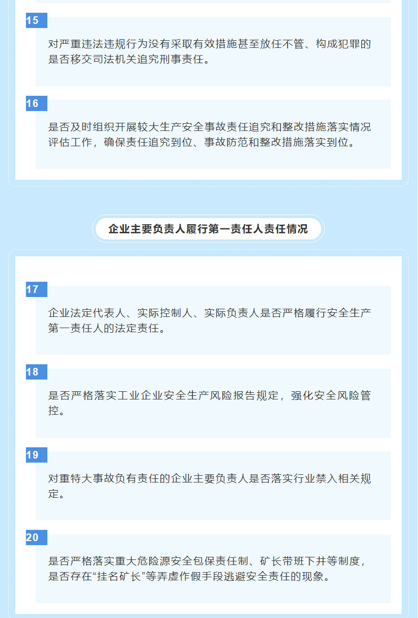 会议要求,要深入学习贯彻习近平总书记关于安全生产的重要指示,认真落实李克强总理批示,提高政治站位,充分认清开展安全生产大检查的重要性、必要性、紧迫性,作为一项政治任务抓紧抓实。要坚持目标导向、问题导向、结果导向,严格对照国家“15条硬措施”和我省“50项检查重点”,坚持条块结合,聚焦危化品、建筑施工、城镇燃气、消防、道路运输、水上运输和渔业船舶等重点领域,开展全覆盖检查。要在发现和解决问题上下功夫,即查即改、立行立改,做到隐患见底、措施到底、整改彻底,切实把风险隐患消除在萌芽状态、未发之时。要聚焦五一、汛期、中秋、国庆等重要节点,加强分析研判,打好安全生产主动仗。要压紧压实党政领导责任、部门监管责任、企业主体责任和“三管三必须”,强化过硬作风,力戒形式主义、官僚主义。要提高检查精准性,文明执法、规范执法,加强对企业的服务指导。充分运用信息化手段和受理群众举报等方式,实施高效督导。要统筹做好经济发展、疫情防控和安全生产工作,加强防灾减灾救灾、值班值守和应急处置,确保安全生产形势平稳向好,以实际行动迎接党的二十大胜利召开。