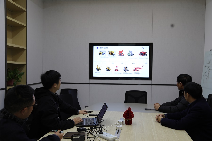 参观结束后,大家来到多媒体室对消防行业与机器人的融合发展之路进行共同探讨。亿嘉和消防产品线负责人卢宗胜首先介绍了消防机器人产品,其间详细讲解了消防产品历程和CAFS灭火装备,对目前瓶颈问题予以咨询,同时对加入协会产生浓厚兴趣。双方就消防机器人在火灾救援、消防演练等领域的应用潜力进行了深入的交流与探讨。